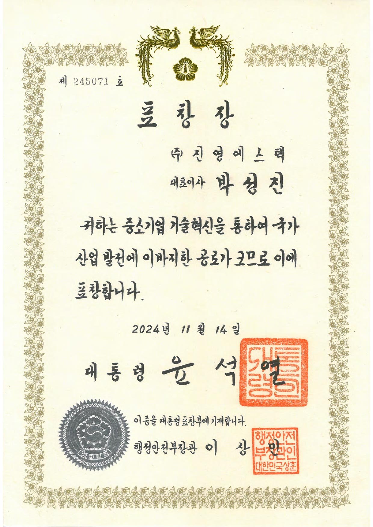 대통령상 수상-중소기업기술경영혁신